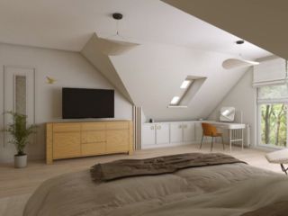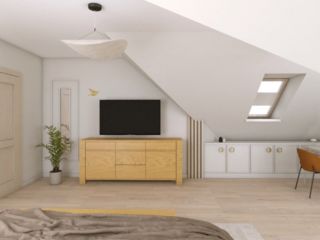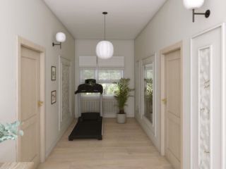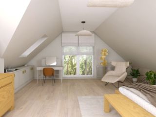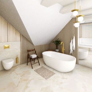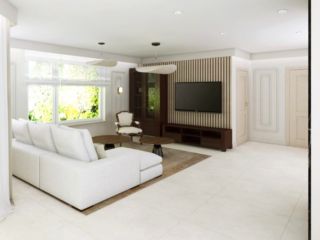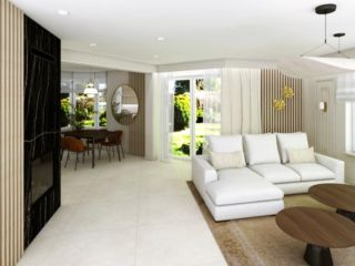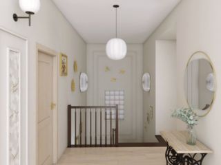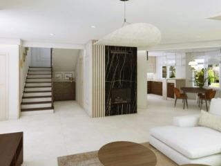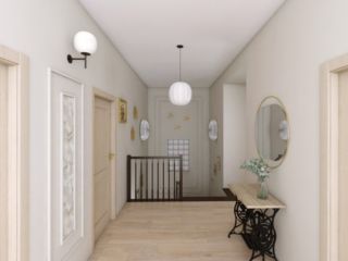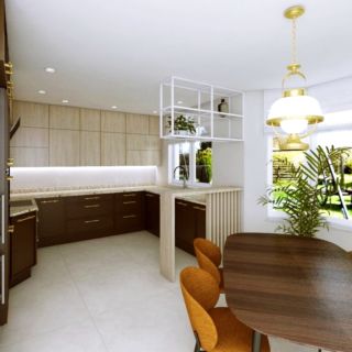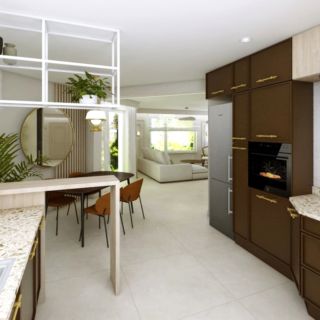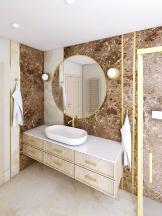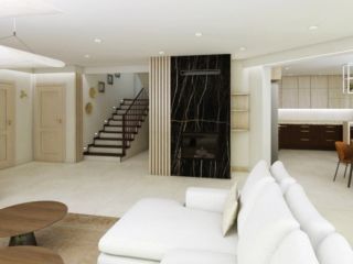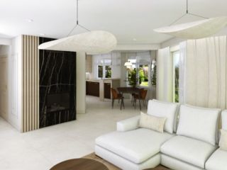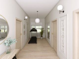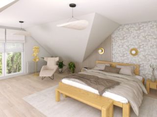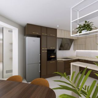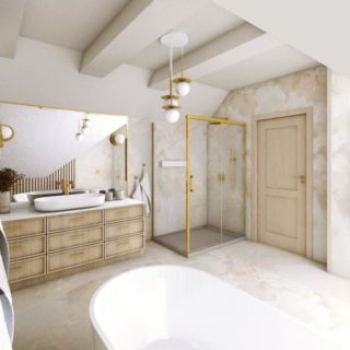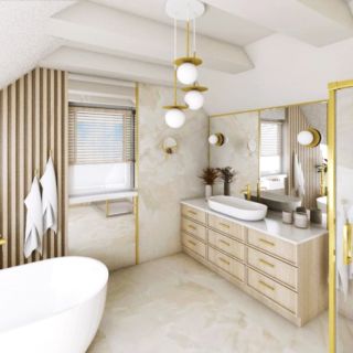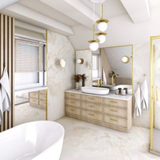 projekt – czerwiec 2022 styl – nowoczesny · klasyczny · eklektyczny Aranżacja domu w Gdańsku widoczna na zdjęciach powstała w 2022 roku. Projekt jest metamorfozą wnętrz urządzonych w ubiegłym dziesięcioleciu, pomieszczenia zostały zaprojektowane od nowa jednak część układu funkcjonalnego wnętrz i wybrane meble, z którymi związani byli właściciele pozostały zachowane. Połączenie elementów nowoczesnych z charakterystycznymi elementami z poprzedniej dekady było niezwykle wymagającym zadaniem. Poprzez dobranie odpowiedniej kolorystyki oraz materiałów udało się spowodować, że meble, które zostały zachowane dobrze komponują się z pozostałymi elementami wyposażenia. Zachowane elementy jednocześnie narzuciły i wpłynęły na decyzje projektowe nie pozostawiając tym samym zupełnej swobody projektantce. Projekt wnętrz łączy nowoczesność z elementami klasycznymi, a wyposażenie oraz rośliny w klimacie boho wprowadzają do pomieszczeń spokój i harmonię. Kolorystyka została zdominowana przez odcienie beżu oraz brązu, które doskonale komponują się z materiałami w kolorystyce jasnego i ciemnego drewna oraz stanowią bazę do stworzenia wnętrz zarazem eleganckich, nowoczesnych jak i stonowanych. W pomieszczeniach pojawiają się dodatki ze szczotkowanego złota wraz z charakterystycznymi dekoracjami z Pap Deco przedstawiającymi motywy roślinne i zwierzęce, które wykonywane są tradycyjną technologią. Składają się na nie ręcznie wykonywane produkty oraz elementy odlewnicze. Po wejściu do domu ukazuje nam się hol z dużą szafą z wnęką na obuwie. Front szafy pokryty jest lustrami, które optycznie powiększają przestrzeń strefy wejściowej. W części dziennej parteru, na którą składa się salon z jadalnią oraz kuchnią podłogi pokryte zostały jasnobeżowymi, wielkoformatowymi płytkami, których faktura przypomina kamień. Materiał ten wybrano z uwagi na ogrzewanie podłogowe znajdujące się na tym poziomie. Elementy sztukaterii na ścianach oraz lamele pokryte fornirem z jasnego drewna, pozwalają na połączenie elegancji z nowoczesnością, nadając jednocześnie delikatny charakter wnętrzu. Lekkość wnętrza uzyskano też dzięki jasnym, rozłożystym lampom. Elementem kontrastowym jasnej przestrzeni jest ściana kominka wykonana ze spieku kwarcowego Noir Desir, imitującego świetnie czarny marmur. Ciekawym elementem w kuchni jest natomiast blat TERAZZO w kolorze beżów i brązów oraz pomarańczy, który idealnie komponuje się z kolorystyką zabudowy kuchennej oraz elementami jadalni. Łazienki w projekcie zyskały nieco bardziej elegancki charakter. Ich bazę stanowią płytki wielkoformatowe o wymiarach 260x120cm, które imitują szlachetny kamień – onyks w kolorze jasnego beżu. Kompozycję uzupełniają elementy w kolorze szczotkowanego złota, z którego zostały wykonane dodatki takie jak armatura, oświetlenie, uchwyty oraz listwy oddzielające płytki. Łazienki oświetlone są przez białe, kuliste lampy ze złotymi dyskami. Z uwagi na potrzeby klienta w łazienkach przewidziano dużo miejsca na przechowywanie pod blatami umywalkowymi co pozwoliło jednocześnie zaproponować duże umywalki oraz zastosować wielkopowierzchniowe lustra. Ze względu na brak możliwości wykonania odpływu liniowego pod prysznicem w obu łazienkach zastosowano niski brodzik wykonany z konglomeratu. Elementem dodającym elegancji łazience na piętrze jest duża wanna wolnostojąca, dla której tłem są lamele wykonane z forniru. Tak usytuowana wanna pozwala na zrelaksowanie się podczas długich kąpieli. Wnętrza znajdujące się na piętrze domu pozbawione są elementów z ciemnego drewna dzięki czemu pozwalają na relaks i odpoczynek. Ściany na piętrze podobnie jak na parterze pomalowane zostały farbą w kolorze piaskowego beżu z nutą szarości, zaś część sztukaterii w holu wypełniona została tapetą. Główny element kompozycji sypialni stanowi ściana za wezgłowiem z jasnymi lamelami oraz ozdobną tapetą. Po drugiej stronie pomieszczenia, w pobliżu okna umieszczono toaletkę oraz wygodny fotel a także zabudowę i miejsce na przechowywanie pościeli.