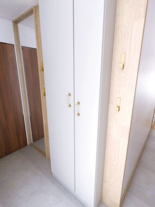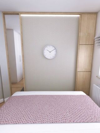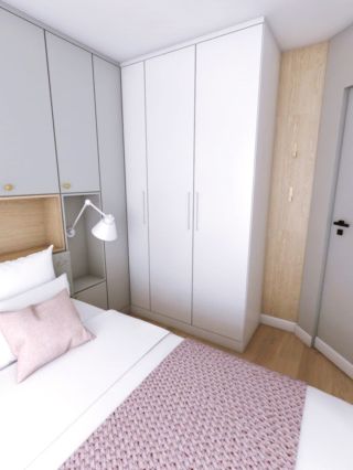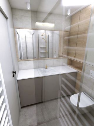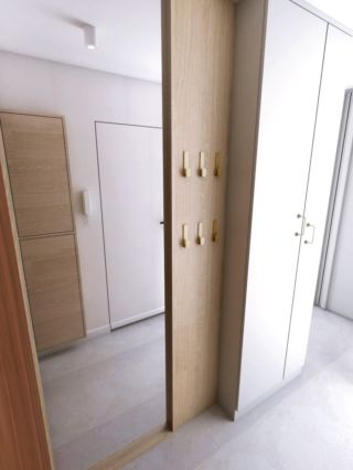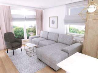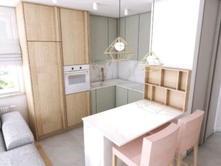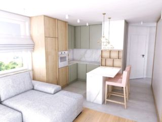Ta pastelowa aranżacja powstała na życzenie małżeństwa, które ze względu na korzystny, morski klimat, postanowiło przenieść się do Gdańska, do mieszkania w nowo wybudowanym budynku mieszkalnym na Przymorzu. Klienci, opisując swoje potrzeby i wymagania odnośnie projektowanego wystroju, kładli nacisk przede wszystkim na wygodę i spokój, ale także nowoczesność, praktyczność i elegancję. Zakres opracowania obejmował wszystkie pomieszczenia lokalu: strefę wejściową, sypialnię, łazienkę oraz salon z aneksem kuchennym. W korytarzu prowadzącym od wejścia do strefy dziennej, na samym jego początku umieszczono wysokie od podłogi do sufitu lustro, powiększające optycznie przestrzeń. Na drewnianym obramowaniu lustra umieszczono haczyki na odzież, a obok znalazło się miejsce dla małej szafy gospodarczej. Drzwi do sypialni znajdują się na rogu korytarza i vis-a-vis wejścia do mieszkania z tego względu zastosowano tu rozwiązanie ze schowaną ościeżnicą a drzwi wykończono w kolorze ściany, dzięki temu udało się „ukryć” je oraz nadać przestrzeni lekkości. Powierzchnię ścian oraz przestrzeń w sypialni wykorzystano do maksimum oraz wygospodarowano potrzebną ilość miejsca na przechowywanie. Niebanalna zabudowa znajduje się na całej ścianie, składa się z szafek oraz wnęk gdzie umieszczono oświetlenie oraz wygospodarowano przestrzeń na przechowywanie i odkładanie niewielkich przedmiotów zastępując w ten sposób tradycyjne stoliki nocne a jednocześnie spełniając ich funkcję. Centralna część zabudowy stanowi zagłówek pokryty panelami tapicerowanym tuż nad nim znajduje się półka na książki czy budzik. Strefa dzienna, jak całe mieszkanie, jest bardzo dobrze rozplanowana. Zabudowa kuchenna otwarta jest na salon a oddzielona została od korytarza półwyspem. Mimo niewielkiej przestrzeni w pomieszczeniu znalazło się miejsce na kuchnię, jadalnię oraz wygodą strefę wypoczynku z szerokim i komfortowym narożnikiem oraz fotelem. Dzięki połączeniu kuchni ze strefą jadalni udało się wygospodarować sporą ilość blatu roboczego, którego cześć służy do przygotowywania a jednocześnie spożywania posiłków. Wysokość blatu roboczego i jadalnianego jest jednakowa, hokery 'niskie’ umożliwiają wygodne spożywanie dań. Ze względu na bliską lokalizację blatu roboczego zaproponowano hokery z pokryciem zdejmowanym, które można wyczyścić kiedy zaistnieje taka potrzeba. Blat zabudowy kuchennej oraz okładzina ściany pomiędzy szafkami kuchennymi, sięgającymi do sufitu wykonane zostały z materiału, który wspaniale oddaje wszystkie cechy marmuru, co więcej – jest od niego o wiele bardziej wytrzymały. Na ścianach znalazło się miejsce na telewizor i zabudowę RTV oraz dekorację ścienną – suszoną roślinę w złotej ramie mimo dużej powierzchni otworów okiennych w mieszkaniu. Kolorystyka i dobór wyposażenia – zastosowano ponadczasowe, modne połączenie pastelowych barw – khaki (fronty kuchennych szafek), pudrowego różu (obicia hokerów, zasłony), ciepłej szarości i bieli. Jako akcent wykorzystano równie modny i ponadczasowy materiał – mosiądz o pięknym złotawym odcieniu pojawiający się w każdym z pomieszczeń (w salonie – stoliki kawowe z nogami z mosiądzu, mosiężne lampy w kuchni, bateria, elementy piekarnika, w przedpokoju, sypialni i łazience – uchwyty mosiężne, haczyki oraz armatura w kolorze złota i mosiądzu. Te liczne detale, które najczęściej są chromowane lub po prostu stalowe wyróżniają się dzięki zastosowaniu koloru mosiądzu i złota oraz ocieplają wnętrza i cały ich wystrój. Idealnie współgrają z dużymi płaszczyznami marmuru, drewna i szarego gresu na posadzce dopełniając kompozycję.