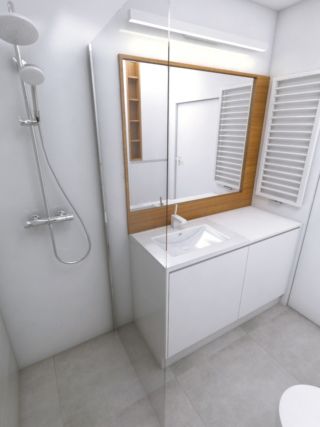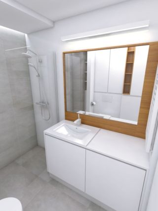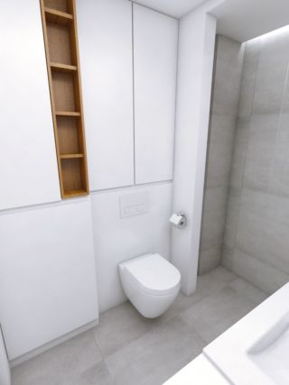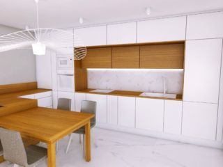 Projekt powstał na zlecenie młodego małżeństwa przeprowadzającego się do mieszkania w Gdyni. Rozpoczęli urządzanie swojego mieszkania od zaprojektowania dwóch wymagających dobrego rozplanowania funkcjonalnego przestrzeni w mieszkaniu – kuchni oraz łazienki. Parze zależało na stworzeniu wnętrza jasnego i nowoczesnego. Otrzymaliśmy od klientów kilka inspiracji, które przedstawiały kuchnie jasne, w których pojawiały się drewniane elementy o ciepłym odcieniu, wnętrza którymi się inspirowali miały także inny element wspólny – podłogi pomieszczeń wykończone były wielkoformatowymi płytkami w kolorze betonu lub wykończone płytkami imitującymi kamień – marmur. Na podstawie zebranego materiału rozpoczęliśmy proces projektowy od funkcjonalnego rozplanowania pomieszczeń. Wprowadziliśmy zmiany w ustawieniu pierwotnie zaproponowanego przez dewelopera aby klientom jak najlepiej korzystało się z zaprojektowanego przez nas wnętrza. W łazience postanowiliśmy przenieść pralkę na przeciwną ścianę i umieścić ją w zabudowie. Umieszczenie pralki w szafce obok umywalki spowodowało, że obok miski wc zyskaliśmy wolną przestrzeń. Zabieg ten pozwolił na zaprojektowanie w miejscu pierwotnie znajdującej się tam pralki wysokiej zabudowy meblowej przeznaczonej na zabudowany kosz na pranie oraz miejsca nad nim na przechowywanie ręczników. Dodatkową zabudowę udało nam się wygospodarować we wnęce, nad miską wc, która będzie miejscem do przechowywania środków czystości. Żeby urozmaicić zabudowę znajdującą się na jednej ścianie zaprojektowaliśmy drewnianą wnękę z półkami, gdzie użytkownicy wnętrza będą mogli przechowywać dekoracje bądź drobne kosmetyki. Autem niewielkiej łazienki jest miejsce na długi i szeroki prysznic osłonięty jednoelementową stałą ścianką prysznicową. Wykorzystaliśmy maksymalnie przestrzeń kuchni i zaprojektowaliśmy zabudowę w kuchenną w kształcie litery U połączoną ze stołem. W centralnej części zabudowy znajdują się szafki dolne oraz szafki wiszące, które otoczone są z dwóch storn wysokimi słupkami zabudowy – z jednej strony piekarnikiem i mikrofalówką w słupku z drugiej strony lodówką w zabudowie. Takie rozplanowanie zabudowy stworzyło na osi pomieszczenia wizualną wnękę w zabudowie, która po wykończeniu płytą meblową pokrytą fornirem drewnopodobnym jest ozdobą kuchni samą w sobie a funkcjonalnie wydzieliła przestrzeń na blat roboczy ze zlewozmywakiem i płytą indukcyjną. Dodatkowy blat roboczy znalazł się na przedłużeniu zabudowy znajdującej się na prostopadłej do opisywanej ściany z wnęką, który następnie jest kontynuowany jako stół jadalniany z miejscem na 4 osoby. Część zabudowy znajdująca się tuż przy stole jadalnianym i od strony salonu została zaprojektowana jako miejsce – półki na wino oraz wnękę z donicą na świeże przyprawy. Kolorystyka mieszkania utrzymana jest w bieli oraz naturalnym, ciepłym kolorze drewna, dodatkowo w mieszkaniu pojawiają się materiały imitujące kamień – w kuchni płytki o wzorze marmuru oraz w łazience płytki przypominające beton. Nowoczesna i minimalistyczna forma wnętrz ozdobiona jest eleganckim i nowoczesnym oświetleniem. W kuchni znajdują się regularnie rozmieszczone oprawy natynkowe – kształt tuby, a nad jadalnią znajduje się piękna, biała, rozłożysta lampa Vertigo marki Petite Friture, która przyozdabia wnętrze. Łazienkę z góry oświetla nowoczesny plafon sufitowy wpuszczony w sufit podwieszony a nad lustrem znajduje się podłużny, biały kinkiet. W pomieszczeniach poza oświetleniem głównym zastosowano również oświetlenie ozdobne i nastrojowe – w kuchni pod szafkami znajduje się oświetlenie LED, które pięknie oświetla część roboczą blatu natomiast w łazience zastosowano podświetlenie ściany prysznica, pasek ledowy umieszczony we wnęce sufitu podwieszanego eksponuje betonową ścianę prysznica.