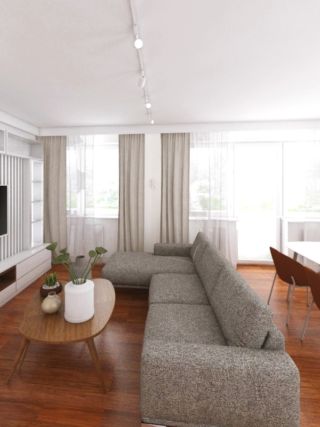 Na podstawie zebranego materiału rozpoczęliśmy proces projektowy od funkcjonalnego rozplanowania pomieszczeń a następnie stworzenia moodboard – określenia charakteru wnętrz, dobrania odpowiedniej kolorystyki, wyboru faktur, tkanin i obić, które pojawią się w koncepcji. Kolejnym krokiem było już stworzenie wizualizacji, na których zaproponowane zostały dokładne propozycje mebli, zabudów na wymiar oraz innych materiałów i elementów wyposażenia wnętrza.