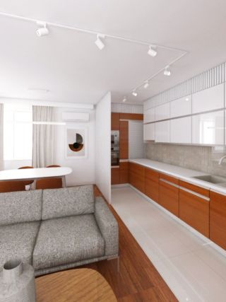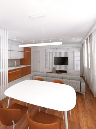 Dzięki zmianie pierwotnie panującego układu funkcjonalnego w części dziennej mieszkania sprawiliśmy, że przestrzeń salonu z aneksem kuchennym i jadalnią stała się wygodna i komfortowa w użytkowaniu, dobraliśmy również odpowiednie dla tego układu rozmiary oraz formę mebli. Istniejącą zabudowę aneksu kuchennego rozbudowaliśmy pod sam sufit wykorzystując w ten sposób przestrzeń a także zmieniając dzięki temu jej formę na bardziej korzystną. Dodatkowy, wiszący pas zabudowy kuchennej pozwolił także na zmianę charakteru kuchni, poprzez zastosowanie frontów frezowanych kuchnia zyskała na estetyce a także stała się spójna stylistycznie z pozostałą częścią pomieszczenia – m.in. projektowaną przez nas zabudową RTV. Drugi zabieg jaki zastosowaliśmy w obrębie kuchni to oddzielenie jej częściowo ażurową ścianką z lameli od pozostałej przestrzeni. Pozwoliło to na ukrycie części blatu roboczego a także słupka kuchennego z piekarnikiem i mikrofalą. Ścianka pozwoliła również na rozdzielenie funkcji kuchni od sąsiadującej z nią jadalnią. W strefie salonu została zaprojektowana zabudowa RTV z lamelami zakrywającymi okablowanie, półkami na książki, oświetleniem LED, przeszklonym barkiem oraz szufladami pod telewizorem. Wszystkie ściany w pomieszczeniu jak i zabudowa są w kolorze białym, który ciekawie podkreśla różne odcienie drewna pojawiające się we wnętrzach a także dodaje świeżości w pomieszczeniach.