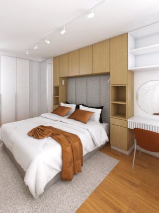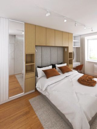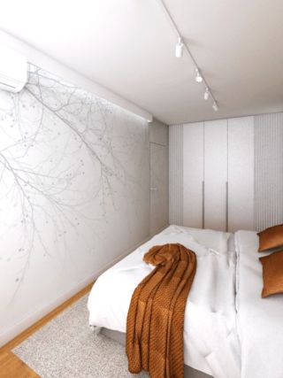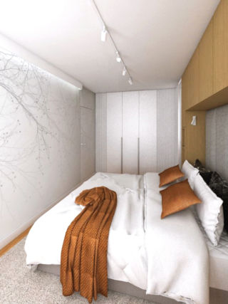 Parze zależało na stworzeniu wnętrz jasnych i nowoczesnych. Otrzymaliśmy od klientów wiele inspiracji, które przedstawiały wnętrza o takim charakterze, w których pojawiały się drewniane elementy, odcienie szarości oraz proste formy. Wnętrza którymi się inspirowali miały także inne charakterystyczne elementy takie jak zabudowa meblowa nad łóżkiem, panele tapicerowane, duża ilość zabudów na przechowywanie z półkami czy wielkoformatowa tapeta na ścianie.
