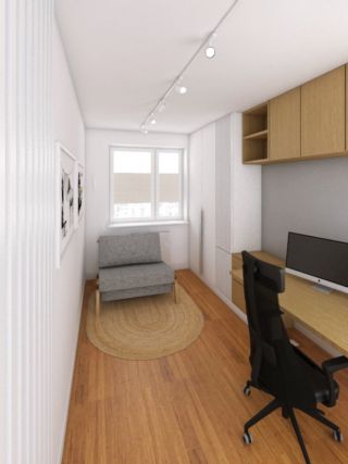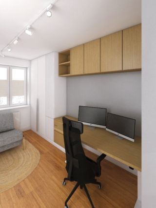 Druga sypialnia posiada dwie funkcje – biurową oraz gościnną. W pomieszczeniu główną rolę odgrywa automatyczne biurko z możliwością regulacji wysokości blatu przeznaczone do pracy zdalnej z miejscem na dwa monitory i wygodne, ergonomiczne krzesło. Podobnie jak w głównej sypialni zaprojektowaliśmy dużo miejsca do przechowywania. Nad biurkiem znajdują się szafki wiszące o gładkich fornirowanych frontach z częścią otwartą na książki, obok biurka zaprojektowana została szafka z szufladami na różnego rodzaju przedmioty biurowe oraz miejscem na postawienie drukarki. Obok części biurowej zaprojektowana została duża szafa na całą wysokość pomieszczenia z frontami gładkimi oraz ryflowanymi. Słupek szafy z frontem ryflowanym przeznaczony na segregatory rozdziela cześć biurową szafy od gościnnej, w której znajduje się miejsce na ubrania gościa. W tej części pomieszczenia znajduje się część sypialniana, gdzie mamy małą rozkładaną sofę o szarym filcowym obiciu. Na ścianie naprzeciwko biurka mamy lamele ścienne w kolorze białym oraz postery w białych ramach z grafikami przedstawiającymi prace Banksy ego, których nasz klient jest wielkim fanem. To pomieszczenie zamykane jest również drzwiami ukrytymi pomalowanymi pod kolor ściany – szary.