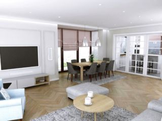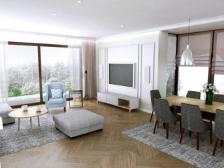 Kolorystyka ścian w pomieszczeniach jest spójna, oprócz przeważającej bieli pojawiają się cieple odcienie szarości. W tych samych barwach są dywany znajdujące się na drewnianym parkiecie. Dobrane wyposażenie tworzy kompozycję elementów klasycznych i nowoczesnych które nie kontrastują ze sobą, lecz współgrają dając poczucie harmonii.