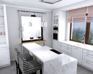 Kuchnia, jest pomieszczeniem doskonale nasłonecznionym (pojedyncze okno na bocznej ścianie i podwójne nad zlewozmywakiem) co zostało podkreślone jasnym wykończeniem zabudowy oraz blatami z białego kamienia). W centrum znajduje się wyspa, na której, od strony zabudowy znajdują się – blat roboczy i płyta indukcyjna. Po drugiej stronie blat wyspy został podniesiony, w ten sposób wydzielono dwa miejsca do spożywania posiłków.