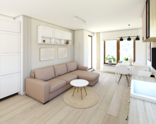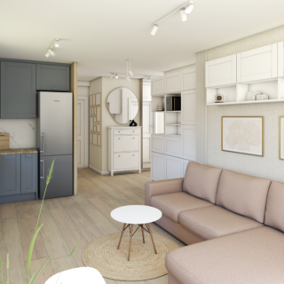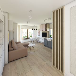 Projekt tego gdańskiego mieszkania to odpowiedź na potrzebę stworzenia azylu, który łączy w sobie funkcjonalność miejskiego apartamentu z przytulnością stylu soft-minimalism. Głównym wyzwaniem było optyczne powiększenie strefy dziennej przy jednoczesnym wydzieleniu wyraźnych funkcji: wypoczynkowej, jadalnianej oraz kuchennej. Dzięki zastosowaniu spójnej palety barw i przemyślanej zabudowy stolarskiej, udało nam się stworzyć wnętrze, które „oddycha” i zachwyca harmonią.