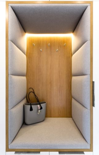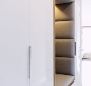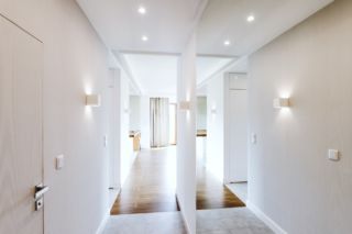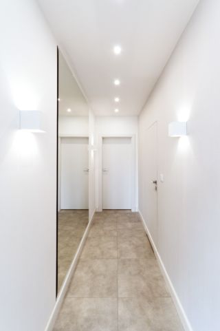 Układ funkcjonalny pomieszczeń jest bardzo konsekwentny. Wiatrołap stanowi początek hallu, który prowadzi od strefy wejściowej, do strefy nocnej (na prawo), zaś po drugiej stronie otwarty jest na część dzienną i kuchnię. W strefie wejściowej znajduje się pojemna szafą z białymi, lakierowanymi frontami oraz z tapicerowana wnęką o funkcji siedziska. W strefie korytarza prowadzącego do części nocnej, naprzeciw drzwi prowadzących do łazienki zastosowano imponujących rozmiarów lustro, które optycznie skraca korytarz.