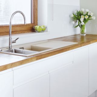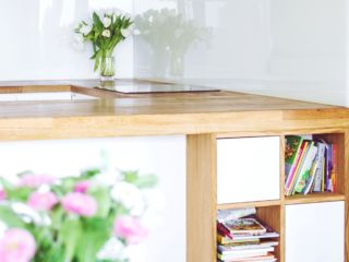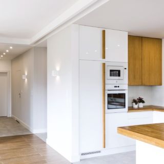 Kuchnia doświetlona jest dużym, podwójnym oknem na dłuższej ścianie – nad zlewozmywakiem. Z tego względu większość przestrzeni do przechowywania wygospodarowano pod długim blatem z drewna klejonego, w kształcie litery U. Na krótszej ścianie zgrupowane są lodówka, kuchenka mikrofalowa i piekarnik. Po drugiej stronie znajduje się płyta indukcyjna, odległość pomiędzy urządzeniami daje odpowiednią ilość miejsca do wygodnego przygotowywania posiłków. Od strony salonu pod blatem zabudowy kuchennej znajduje się wnęka, która pozwala dosunąć się do niego osobom korzystającym z blatu np. w trakcie spożywania posiłków. Część dzienna jest przestronna i wspaniale nasłoneczniona oknami z ekspozycją południową. Znajduje się w niej stół jadalny, obszerna narożna sofa, kino domowe oraz kominek.