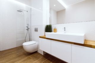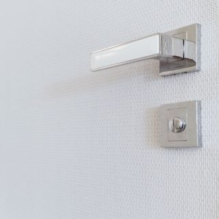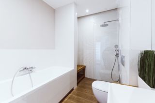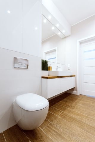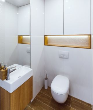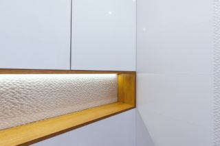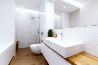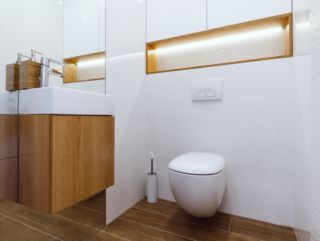 Dom obsługiwany jest przez dwie łazienki, mniejsza dostępna jest z korytarza przy wejściu do mieszkania. Uwagę w korytarzu przykuwa ciekawe wykończenie drzwi do łazienki – drzwi ukryte wykończone zostały tapetą o ciekawym wzorze, która stanowi idealne tło dla eleganckich okuć drzwiowych. W łazience zastosowano podświetlenie LED skierowane na płytki o trójwymiarowej strukturze – we wnęce wykończonej fornirowanym elementem meblowym, nad zabudową podtynkową oraz w zabudowie sufitowej. Oświetlenie listwą LED podkreśla subtelną fakturę wykończenia ściany w tym miejscu, przy czym pozostałe powierzchnie są gładkie. Druga, większa łazienka mieści się w strefie nocnej i zaopatrzona jest nie tylko w wannę ale i natrysk z odpływem liniowym, oddzielony od pomieszczenia cało-szklaną przegrodą. Zastosowano również szeroką umywalkę nablatową, z której mogą korzystać dwie osoby równocześnie.