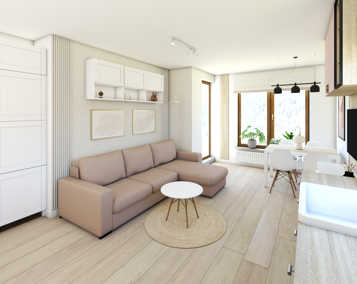 Nowoczesny salon z aneksem kuchennym w Gdańsku: Subtelny mariaż pasteli i dębu: Analiza Przestrzeni: Ergonomia w estetycznym wydaniu Strefa jadalniana, zlokalizowana tuż przy dużym przeszkleniu, płynnie łączy kuchnię z salonem. Stół o lekkiej konstrukcji z krzesłami inspirowanymi ikonami designu (modele DSW) nie przytłacza wnętrza, a czarna, liniowa lampa nad blatem stanowi mocny, graficzny akcent, który porządkuje przestrzeń. Detale i Oświetlenie: Gra tekstur i barw Oświetlenie zostało zaprojektowane wielostrefowo: Oświetlenie techniczne: Białe szynoprzewody pozwalają na precyzyjne kierowanie strumieniem światła na strefy robocze i komunikacyjne. Oświetlenie nastrojowe: Designerskie oprawy nad stołem oraz dyskretne podświetlenia wnęk budują klimat wnętrza po zmroku, wydobywając strukturę pionowych lameli dębowych, które oddzielają przedpokój od strefy wypoczynkowej. Dane techniczne Metraż projektu: Ok. 45 m² (strefa dzienna). Lokalizacja: Gdańsk, nowe budownictwo. Użyta paleta barw: Szałwiowa zieleń, pudrowy róż (blush pink), naturalny dąb, czyste złoto akcentów, biel. Kluczowe materiały: Laminat dębowy, matowy MDF, ceramika, juta (dywan), tekstylia o grubym splocie.